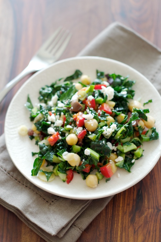 For years we've been getting a similar salad at Whole Foods in their prepared food section. They call it Mediterranean Crunch Salad. I looked at their website and they have a recipe, but it's not like the one in the store. And I was motivated to make this salad because the last time I had the WF salad it was really disappointing, the kale leaves were too big, not enough dressing, not much of anything else, it was more like a plate of kale with nothing on it. And believe me this recipe is so much better and so easy to make I'm embarrassed to say I ever bought it pre-made.