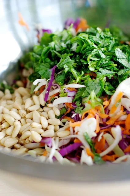 This slaw is really good and very easy to make, it's light and refreshing with fresh herbs and a lime vinaigrette. The recipe is adapted from PBS Fresh Tastes I googled upon, I changed a few things and threw in some pine nuts to boot.
