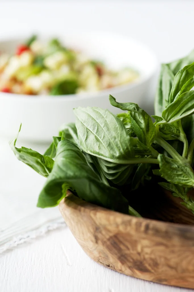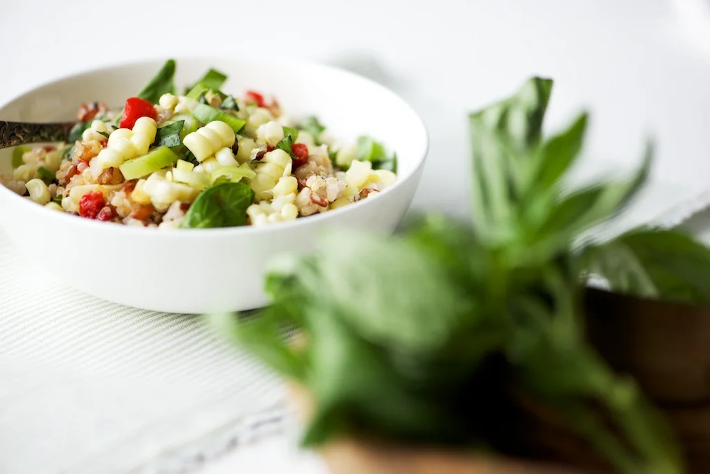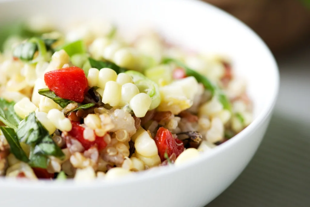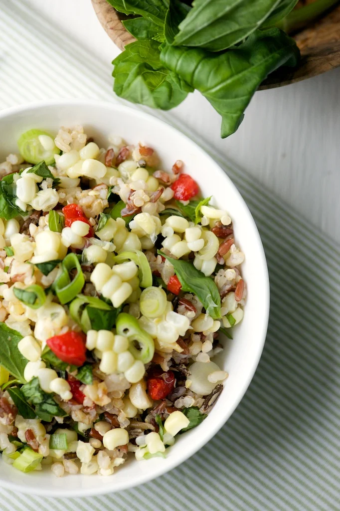 /Corn and Basil. They say summer to me. And if you make one salad this summer it should be this Corn Basil Quinoa Salad. With the first day of summer approaching I thought it would be fitting to make a summer salad. I came across a recipe recently for a corn mint quinoa salad, which was what I intended to make, but the other day I just wasn’t into eating mint in a salad, I still had some basil on hand from the Beet Stacks and it was just sounding a whole lot better. You can use plain quinoa or a quinoa and wild rice mix which is what I had available, and it worked really well, I liked the combined textures. Most importantly, you will want to use corn fresh off the cob for full flavor. There’s just no way around that. There is very good frozen corn available but it just won’t have the texture and flavor that you get from the cut cob.