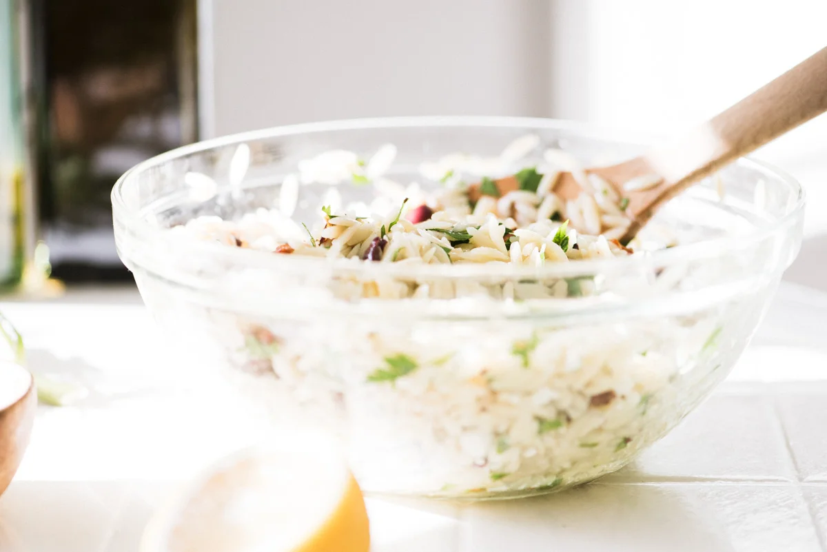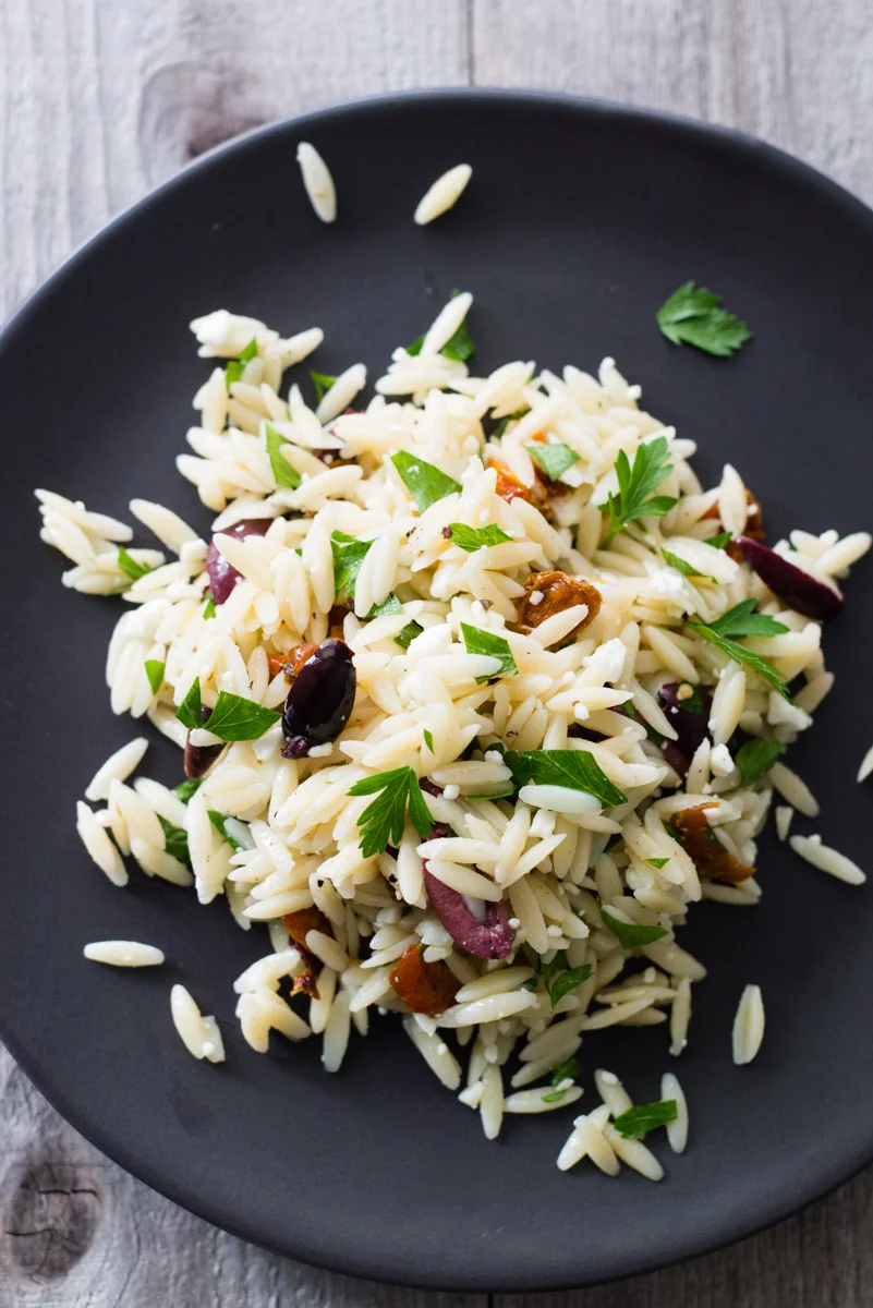 /This is my first time cooking with Orzo and I just love it. On the nights we don’t cook I sometimes get prepared food from our local market New Seasons, they have a salad very much like this that is reliably delicious. I swapped out the roasted red peppers and used the Dried Tomatoes with Herbs which we’ve been stockpiling in the freezer. They add such great flavor to salads like this!