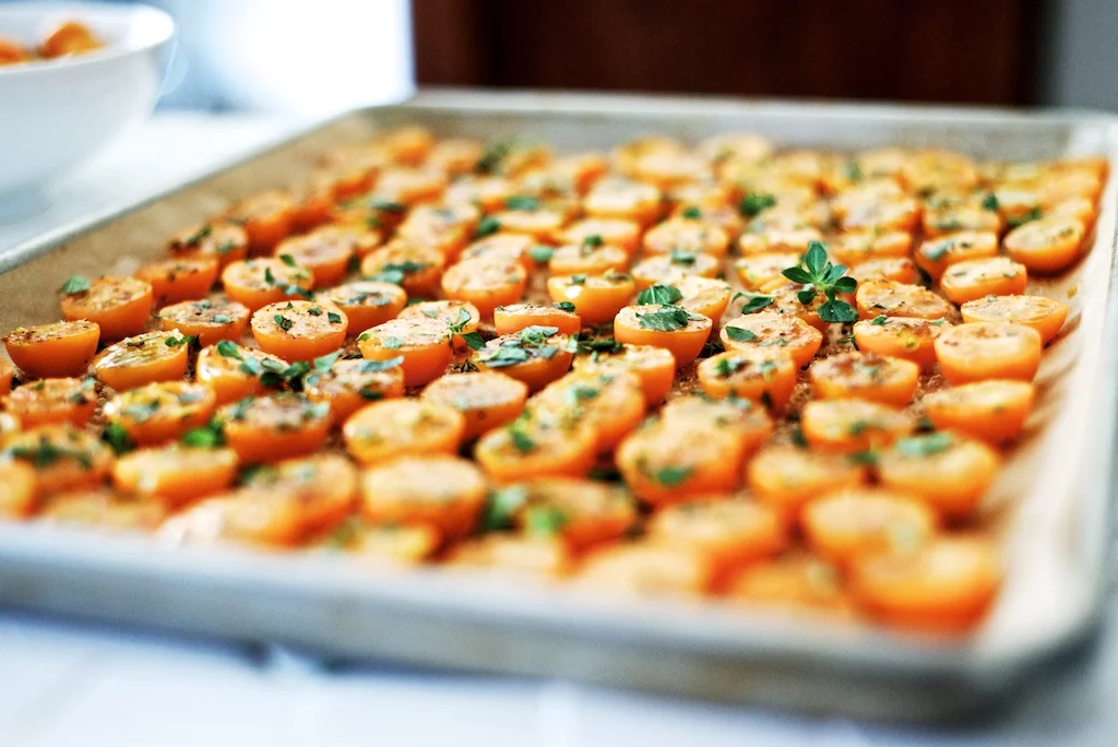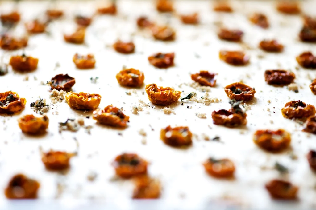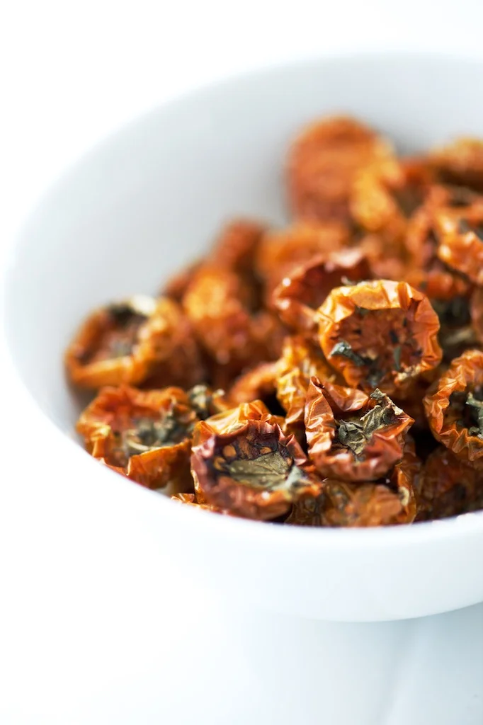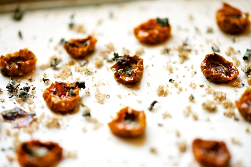 /How many ways can you eat cherry tomatoes? If you are growing tomatoes you probably know the challenges. Our big boy red tomatoes are just now starting to ripen, but we’ve been working our way through many many sun gold tomatoes that you see here. Last year I made a Cherry Tomato Gazpacho which turned out quite nicely, but I’m always anxious to try new things. Our new oven has a dehydration mode, which seemed exciting until I realized it would take up to 12 hours, so I opted for the higher temp with a mere 5 hours of oven use. It seems a little crazy to do this with the hot days we’ve been having, but really a 225° oven doesn’t really warm up the kitchen that much. You will probably see more pickling and preserving here over the next month or so, this is new territory for me, as well as Jeff, but we’re having a lot of fun with it, and the reward will be savoring our garden come winter. I would guess that you could just put the tomatoes on a baking sheet without the herbs and brown sugar, but it really gives it a nice flavor, these would work great in pasta or salads, or even just to snack on, they are so tasty! Enjoy!