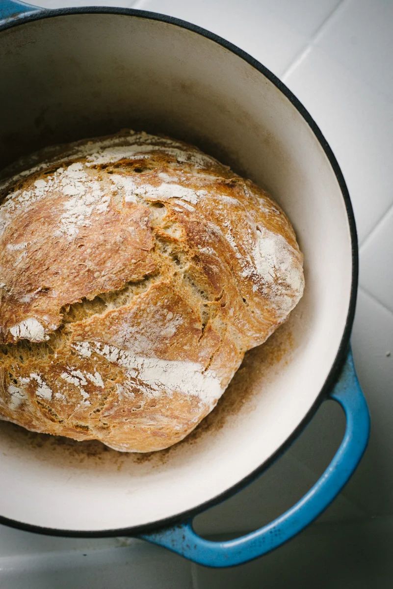 At least a half-hour before dough is ready, heat oven to 450°F. Put a 6- to 8-quart heavy covered pot (cast iron, enamel, Pyrex or ceramic) in oven as it heats. When dough is ready, carefully remove pot from oven. Slide your hand under towel and turn dough over into pot, seam side up; it may look like a mess, but that is O.K. Shake pan once or twice if dough is unevenly distributed; it will straighten out as it bakes. Cover with lid and bake 30 minutes, then remove lid and bake another 15 to 30 minutes, until loaf is beautifully browned. Cool on a rack.